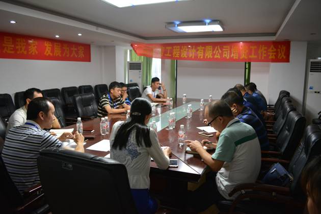 集团于2015年8月5日在南宁总部会议室召开集团设计公司增资工作会议。出席会议的有集团邓安杰董事长、集团罗程常务副董事长、集团黄树威副董事长、集团韦霖副总裁兼设计公司总经理、设计公司全体股东,会议由集团罗程常务副董事长主持。