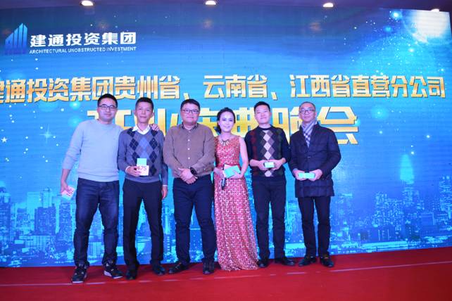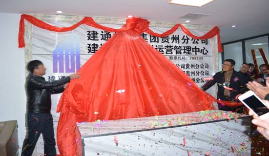 2016年1月9日,在喜庆吉祥的礼炮声中,建通投资集团贵州省直营分公司揭牌仪式在贵州省贵阳市世纪金源财富中心隆重举行,集团董事长邓安杰先生率领集团高层领导参加了揭牌仪式。出席本次揭牌仪式的集团高层领导还有:罗程常务副董事长、黄树威副董事长、谢乃鹏副总裁、刘忠志副总裁、蒙建勋副总裁、罗杰副总裁、黄承理副总裁、李瑜副总裁、苏勇副总裁、李正琦副总裁、陈映伶副总裁、崔巨雄总裁助理、黄易英总裁助理、谭波总裁助理、赵科亮副总经理、刘剑副总经理、罗新华副总经理,集团品牌运营公司熊莎莎副总经理、云南省分公司总经理、江西省分公司总经理、四川省分公司总经理、重庆分公司总经理等分公司领导也一同来到了开业揭牌仪式的现场。