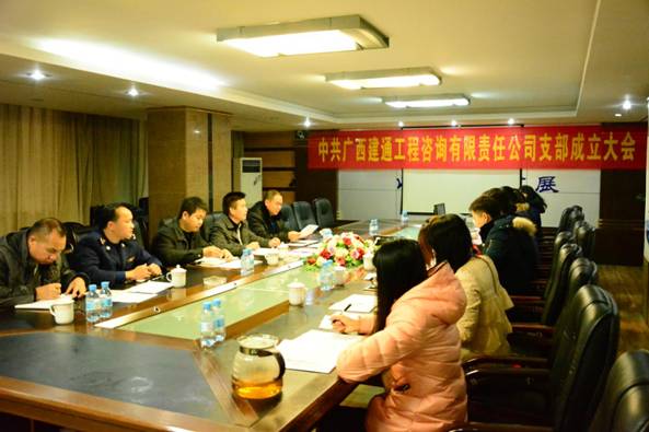 2016年1月14日下午15:00,中共百色市右江区非公有制经济组织和社会组织工作委员会专职副书记、百色市工商行政管理局右江分局企个股副股长、广西建通工程咨询有限责任公司领导、党员等共计20人在广西建通创业大厦6楼会议室召开了中国共产党广西建通工程咨询有限责任公司支部党员大会。