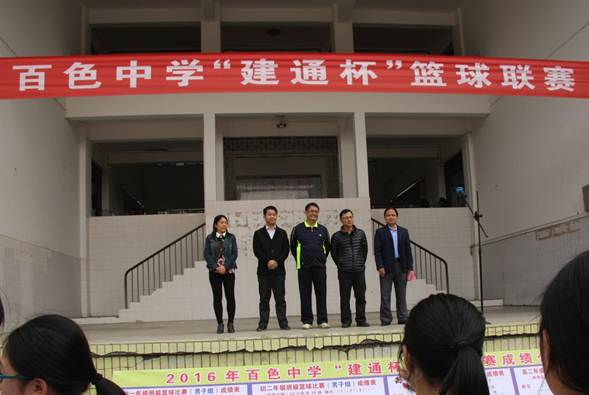 2016年3月14日下午集团副总裁罗 杰、集团副总裁韦 霖应邀参加在百色中学举办的2016年百色中学“建通杯”篮球联赛的开幕仪式,为丰富师生课余校园文化生活,搭建学生展示自我的平台,鼓励全面提高学生素质,广西建通投资集团为本次联赛活动捐助1万元作为联赛资金。
