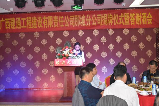在庆典晚宴上,首先由广西建通工程建设有限责任公司那坡分公司总经理王晓玲发表致辞,她说:“德建志远,业通人和”是我们集团最新提出的发展口号,广西建通投资集团是一个朝气蓬勃,充满活力,富有想象力和创造力的企业,集团培养了我们诚信的为人之道,求实的工作作风。分公司将致力加强对员工道德品质的培养,加强对员工专业能力、服务质量的把控,发扬团队精神,为集团品牌建设及战略发展目标添砖加瓦。一如既往秉承“以质量求信誉,以信誉求发展”的理念,为投资者和项目业主提供专业化、高水准、全方位的服务,以专业化的管理做强分公司、做大建通品牌为已任,抓住机遇!共同努力在建通平台上实现更高的人生价值,我公司热忱地期望能与社会各界新老朋友精诚合作、携手共进,创造更加辉煌的未来。
