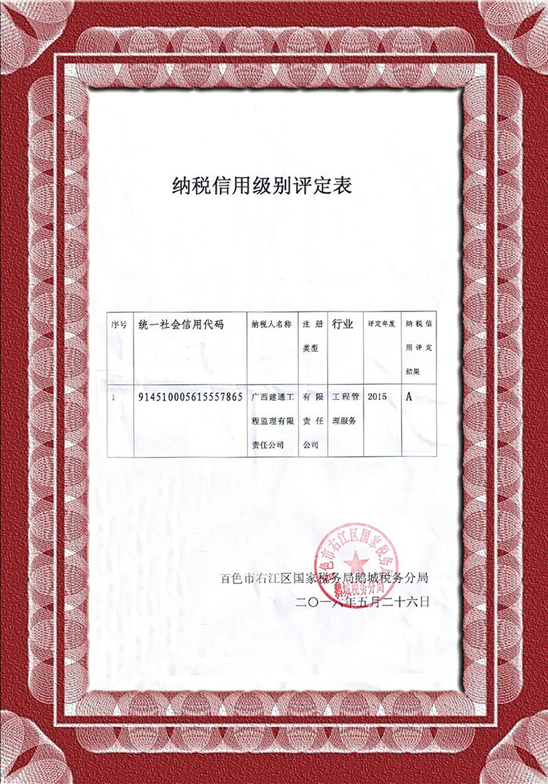诚信是责任、是准则、更是一种资源,广西建通工程监理有限责任公司荣获A级纳税信用等级,将在工程招投标、安全许可、生产许可、资质审核、获得荣誉、投融资等方面作为企业的优质品牌,为企业经营和商务洽谈带来诸多利好!