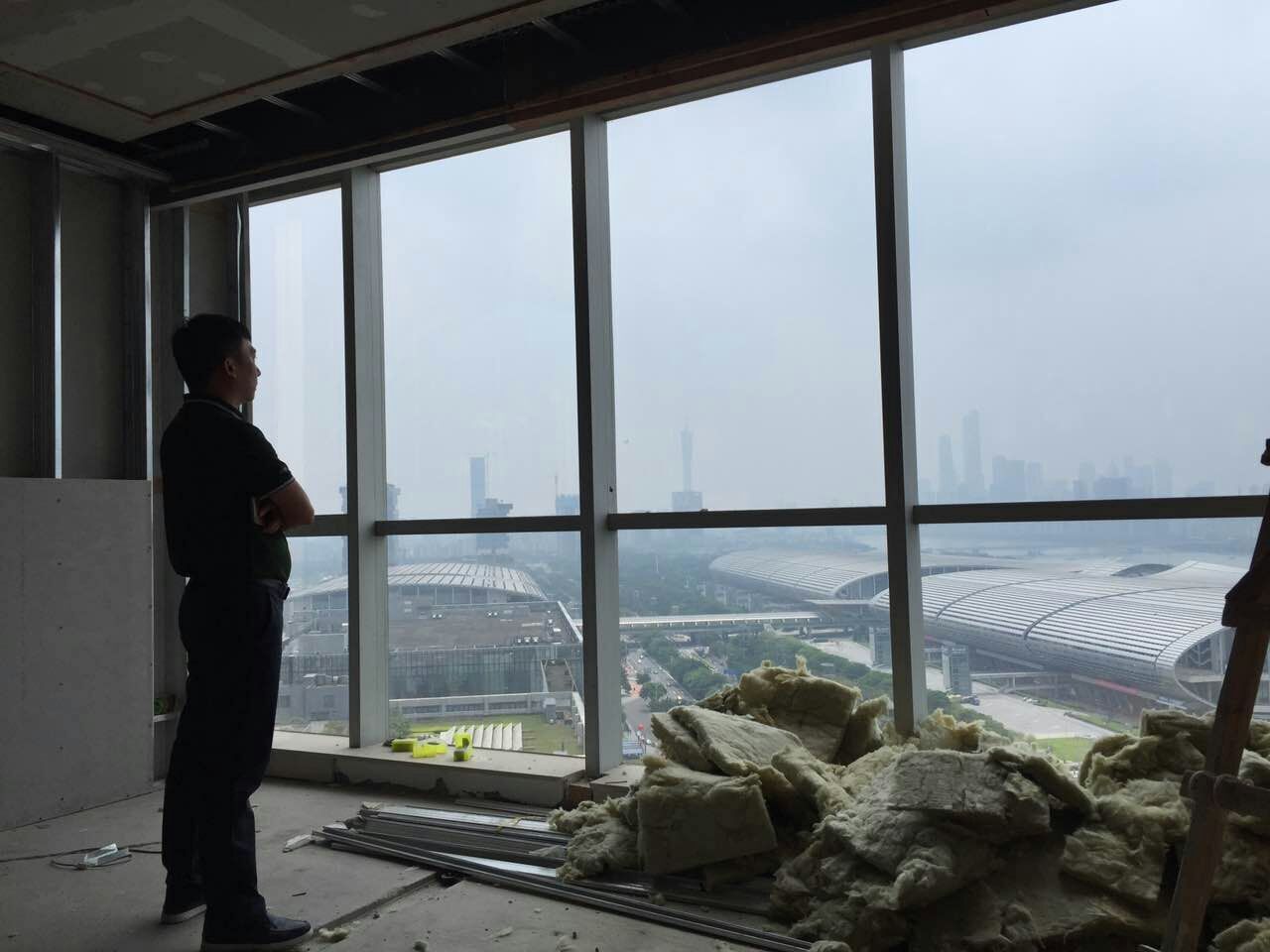 图为邓安杰董事长驻足正在装修的广州总部办公室窗前构思集团发展蓝图
