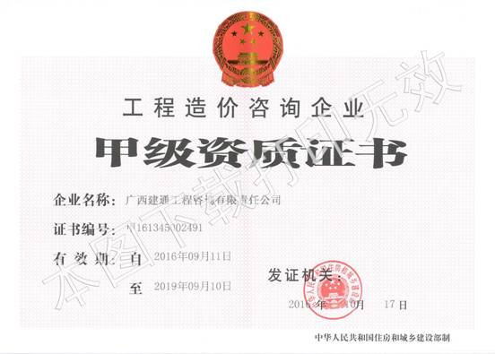 广西建通工程咨询有限责任公司根据《工程造价咨询企业管理办法》,以及《住房城乡建设部办公厅关于甲级工程造价咨询企业资质审核有关事项的通知》要求,工程造价咨询企业资质证书有效期满后,向上级主管部门广西住房城乡建设厅、中华人民共和国住房城乡建设部提交资质延续申请材料,经过审批后于2016年10月17日颁发新资质证书, 证书情况如下:
