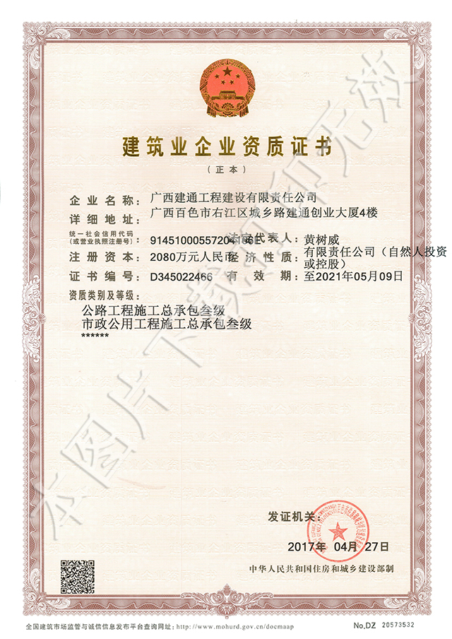 2017年04月27日,从百色市住房和城乡规划建设委员会传来喜讯,建通投资集团旗下子公司广西建通工程建设有限责任公司顺利通过公路工程施工总承包三级资质审查,成功获得该项资质。至此,建通投资集团作为一家拥有工程咨询甲级、工程招标代理甲级、政府采购甲级、工程造价咨询甲级、房屋建筑工程监理甲级、市政公用工程监理甲级等6项甲级资质在内近50项工程建设类国家审批资质的大型工程咨询投资企业,在涵盖工程咨询、工程测量、工程设计、工程招标代理、政府采购招标代理、中央投资项目招标代理、工程施工、工程监理、工程质量检测、工程造价咨询、工程设备租赁、评估拍卖、房地产投资开发、小额信贷等业务基础上,又增加了承揽二级以下公路,单座桥长500米以下、单跨跨度50米以下的桥梁工程施工业务,这标志着建通投资集团旗下子公司广西建通工程建设有限责任公司(拥有建筑工程施工总承包二级资质、建筑装修装饰工程专业承包二级资质、市政公用工程施工总承包三级资质和公路工程施工总承包三级资质)的经营发展迈出了关键性一步,不仅拓伸了公司的业务空间,也为集团的持续快速发展奠定了良好基础。