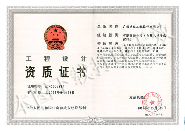 2017年05月18日,从广西住房和城乡建设厅官网再传来喜讯,广西建通投资集团旗下子公司广西建信工程设计有限公司顺利通过了广西住建厅资质审查,成功增项公路行业(公路)专业丙级资质,有效期至2022年4月28日。该资质可承揽三级、四级公路及其交通安全、管理、养护等设施设计业务。至此,广西建通投资集团旗下子公司广西建信工程设计有限公司拥有了建筑行业(建筑工程)乙级、市政行业(给水工程、排水工程、道路工程)专业乙级、风景园林工程设计专项乙级、城乡规划编制乙级和公路行业(公路)专业丙级等资质。