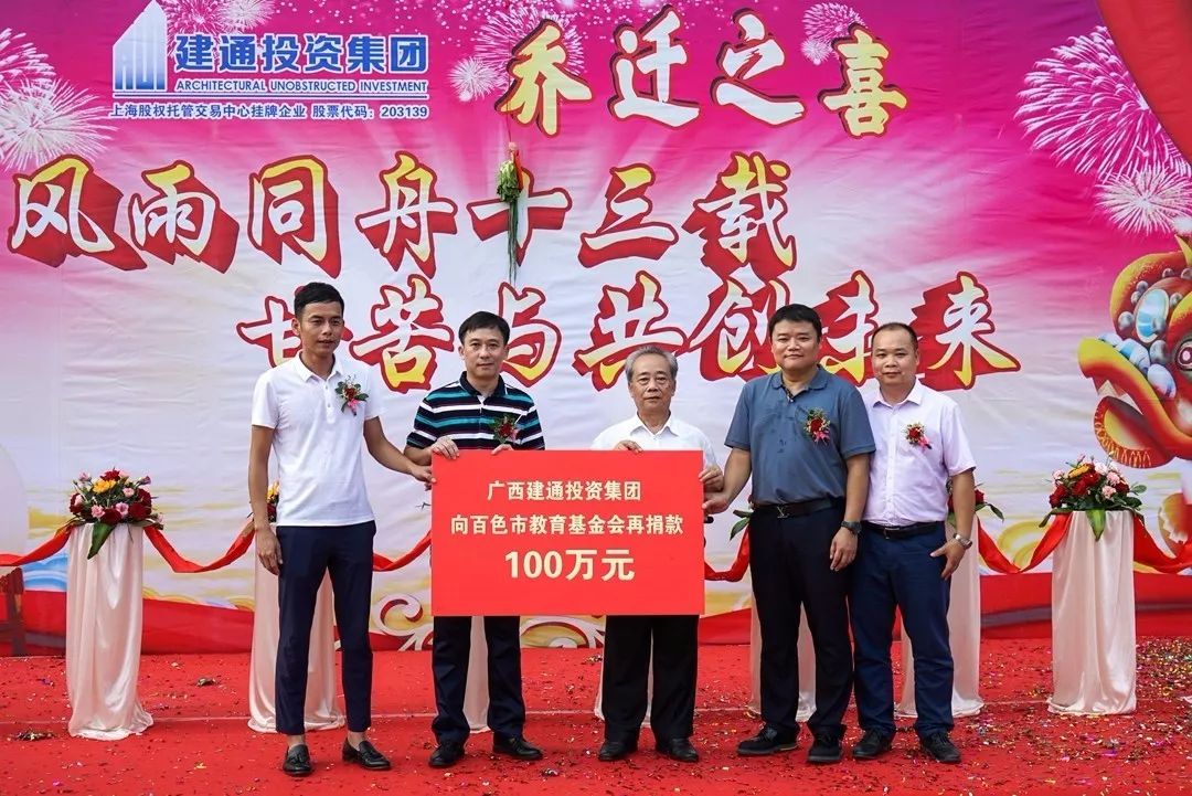建通投资集团百色总部乔迁庆典上集团向百色市教育基金会再度捐款100万元