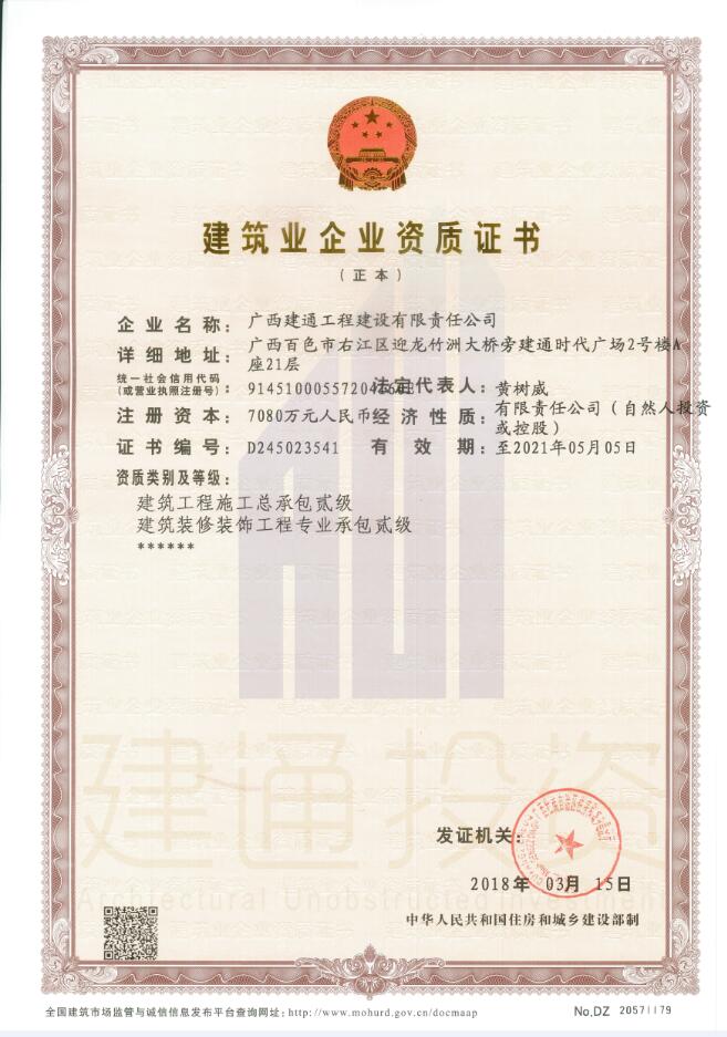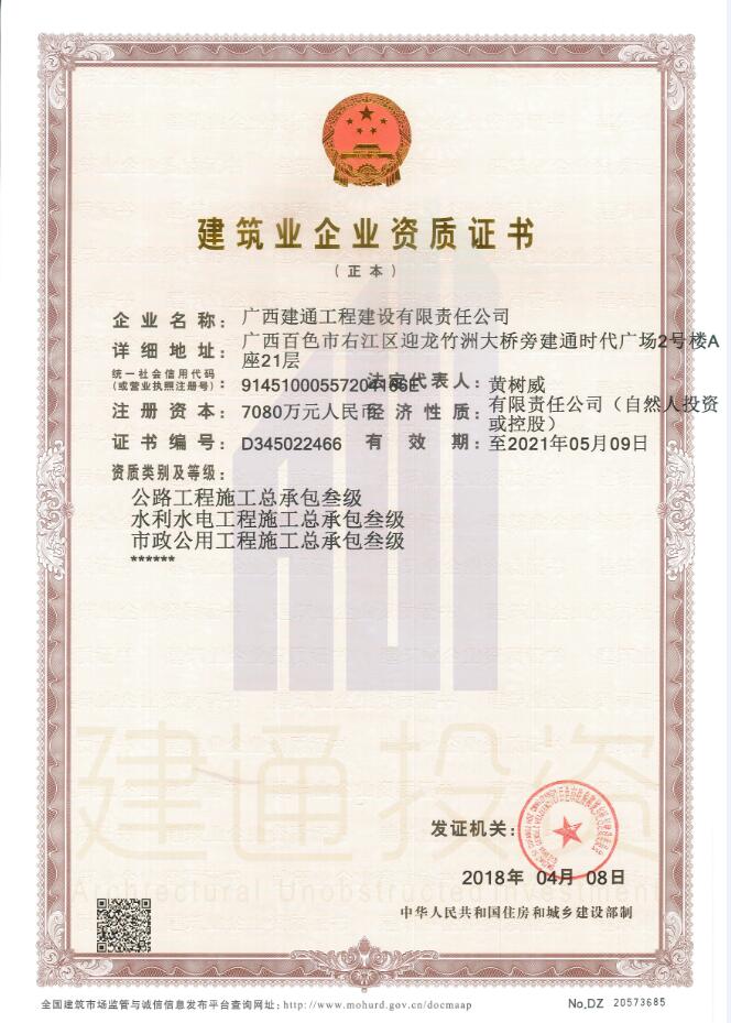 2018年04月08日,建通投资集团旗下子公司广西建通工程建设有限责任公司成功增项水利水电工程施工总承包叁级资质并取得证书,目前建通建设公司所拥有的资质及等级为:
