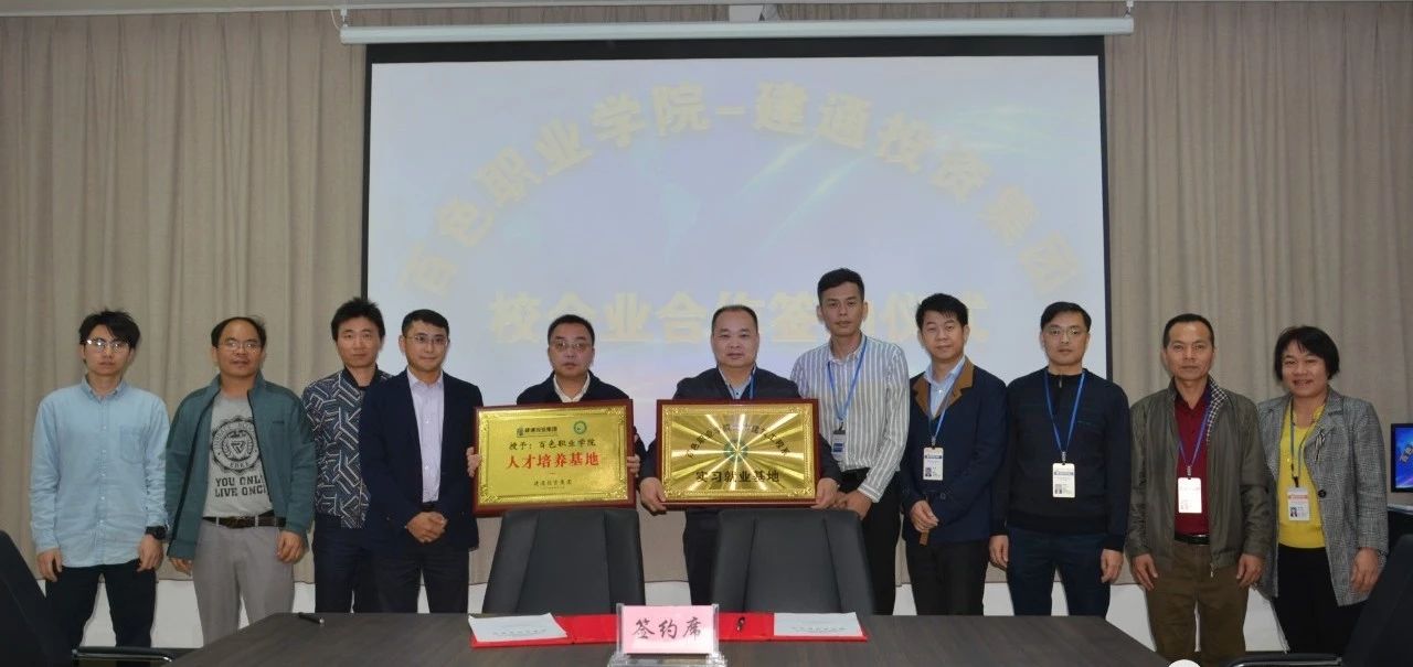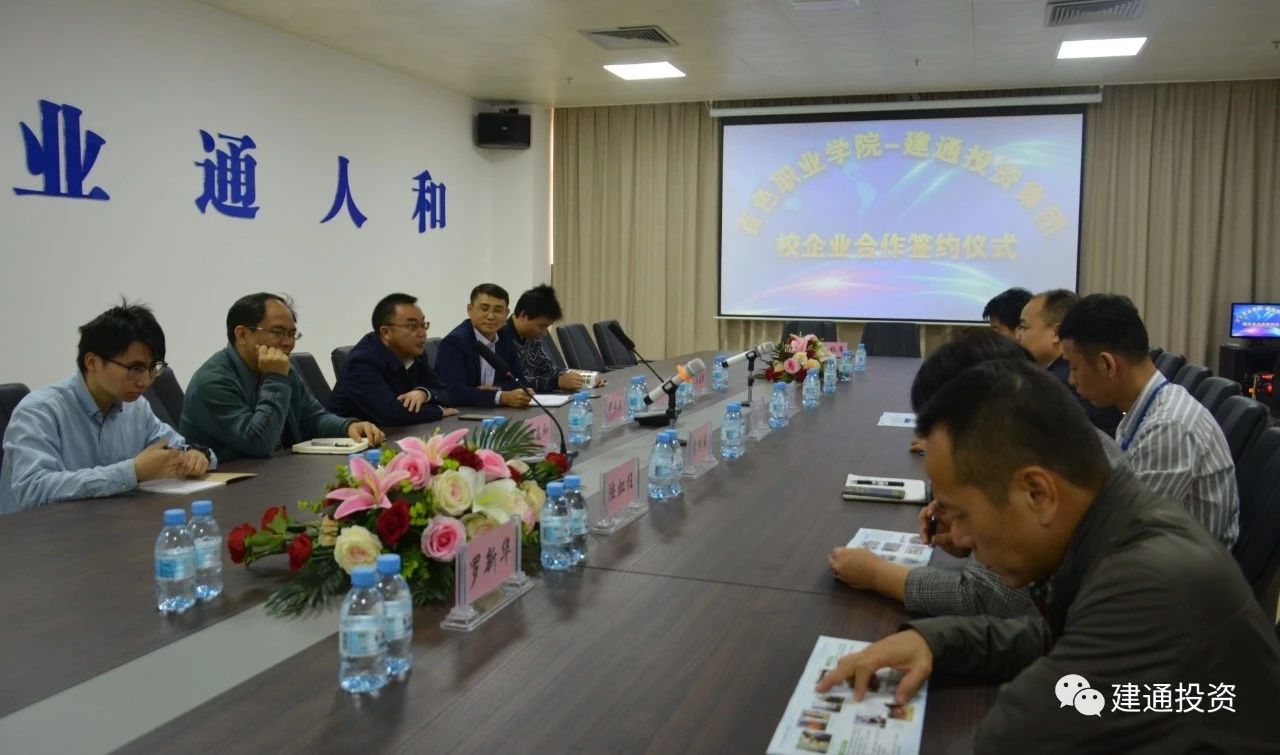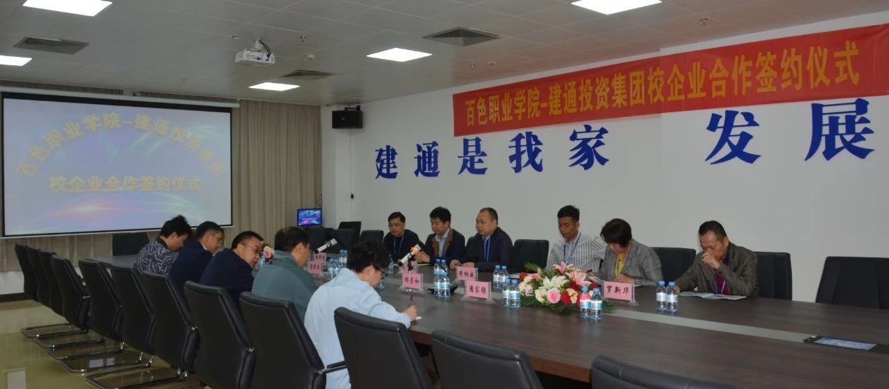 2019年4月2日上午10:30,百色职业学院-建通投资集团校企业合作签约仪式在我集团百色总部“建通中心”2号楼A座2楼会务室顺利召开,并成功签约。出席此次签约仪式的嘉宾有集团副董事长、总工程师谢乃鹏、集团副董事长黄树威等集团高层领导与百色职业学院党委委员副院长那家法、党委宣传部部长杨昌和等5位校领导。校企双方精诚合作,携手共进。