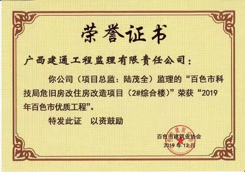 我集团子公司承接的《百色市科技局危旧房改住房改造项目(2#综合楼)》项目荣获了2019年百色市优质工程称号。