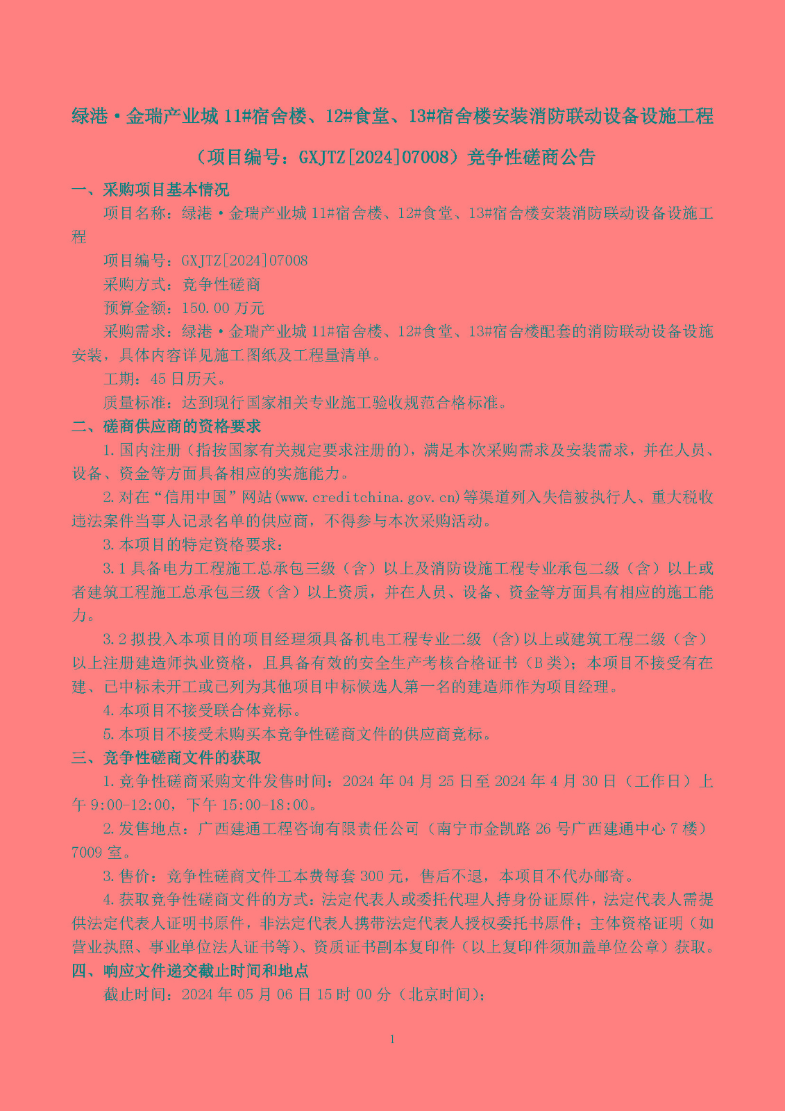 绿港·金瑞产业城11#宿舍楼、12#食堂、13#宿舍楼安装消防联动设备设施工程 (项目编号:GXJTZ[2024]07008)竞争性磋商公告