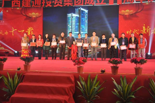 庆典晚宴上,集团邓安杰董事长在致辞中对各位嘉宾客户的到来及全体员工的多年辛勤付出表示衷心地感谢,他指出2014年是集团睿智成长的一年,也是充满了艰辛与挑战的一年,集团董事会审时度势及时适度调整集团战略和管理模式,在激烈的市场竞争中及时适应了经济发展的新常态,呈现出逆势而上的发展态势,在做大做强传统主业的前提下,集团董事会创造性的进行了国内资本市场战略发展布局,在人才培养,资质管理、集团文化建设、市场拓展、品牌加盟,房地产投资开发等各方面取得了令人欣慰的成绩,2014年度集团及下属子公司取得了含房屋建筑工程监理甲级、市政公用工程监理甲级在内10余个资质,集团旗下子公司广西建通工程咨询有限责任公司在上海股权托管交易中心成功挂牌,标志着集团在登陆国内创业板上市的路途中迈出了最为关键的一步,也预示着集团进入了一个新的历史发展阶段。2014年,建通集团继续积极参与社会公益事业,回馈社会、回报家乡,其间包括向百色教育基金会捐赠100万元捐赠百色中学建通特困班、出资100万元承办2015——2019年百色市建通杯羽毛球超级争霸赛,以自身行动大力支持百色教育和体育事业发展。